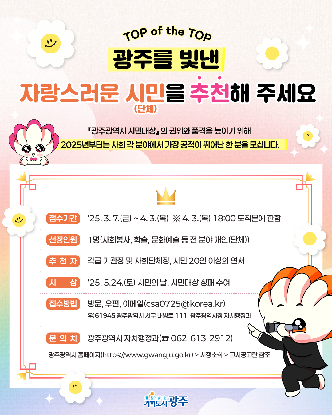광주광역시 시민대상 조례에 따라 2025년도 제38회 광주광역시 시민대상 수상후보자를 다음과 같이 공모합니다.