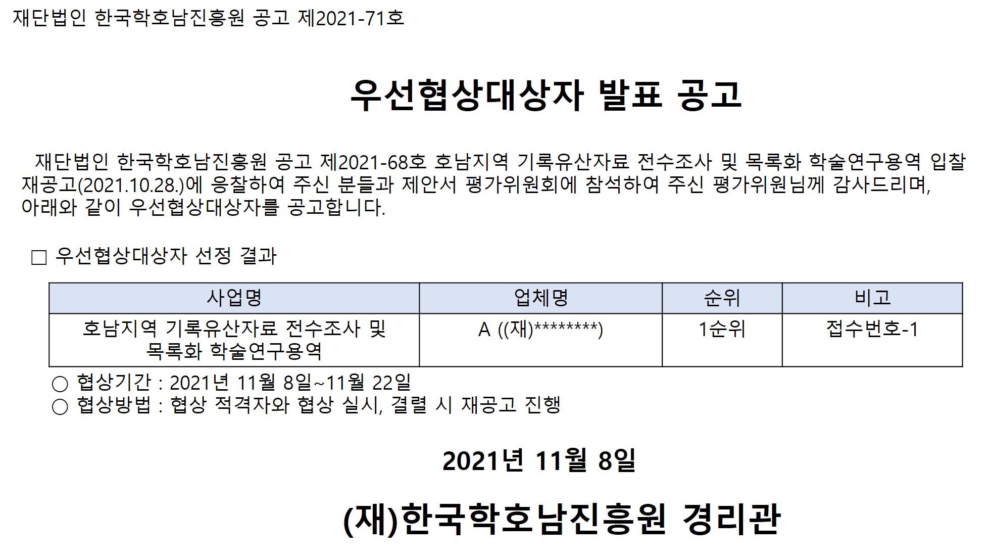 우선협상대상자 발표 공고(호남지역 기록유산자료 전수조사 및 목록화 학술연구용역)