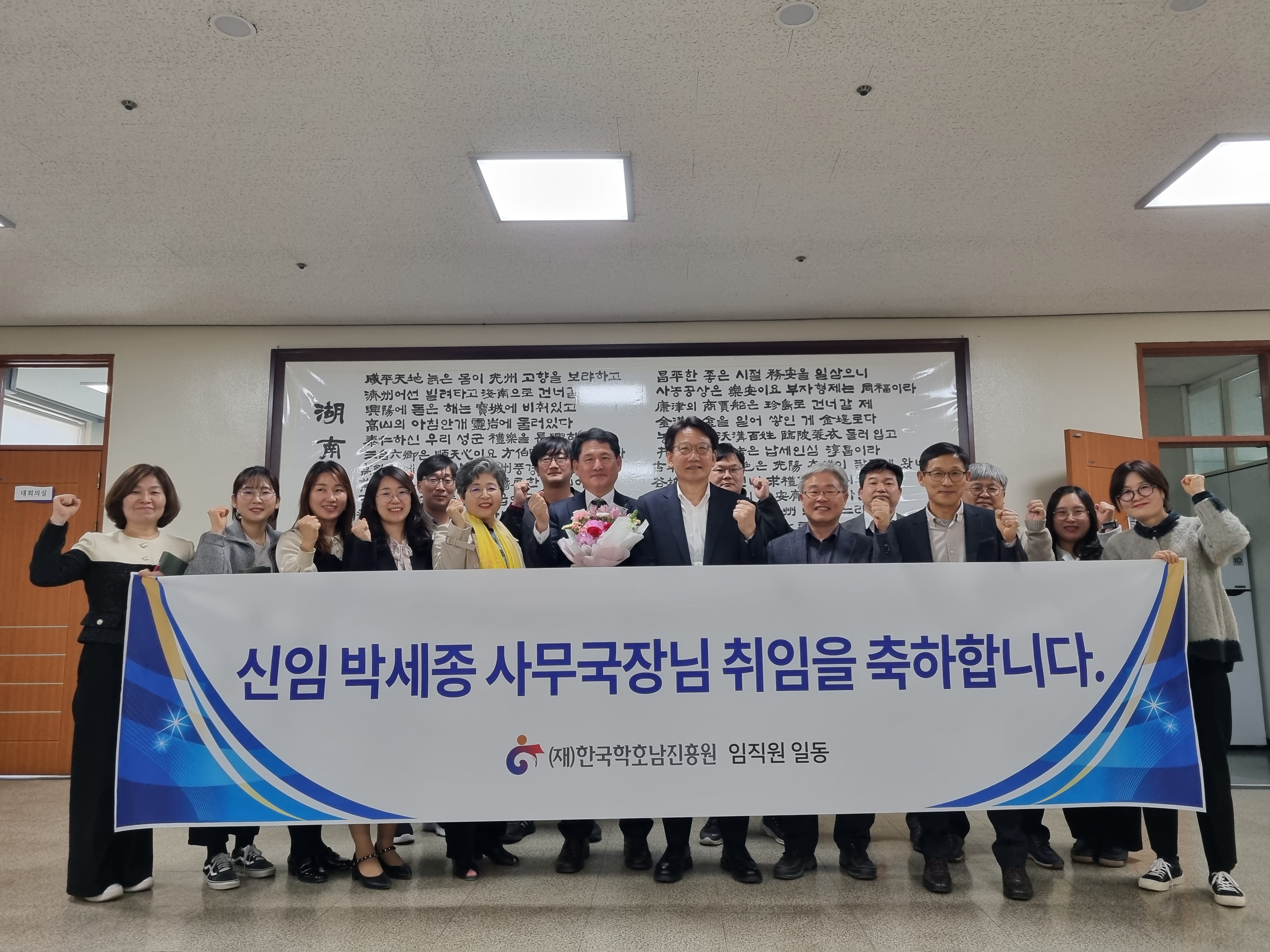 (재)한국학호남진흥원 사무국장 취임 환영식 개최 조회수 : 872 첨부파일 1.jpg (2.97 MB) 미리보기 다운로드 첨부파일 2.jpg (854.99 KB) 미리보기 다운로드 새롭게 취임하는 사무국장을 환영하고 직원들과 인사하는 시간을 가졌습니다. ■ 행사개요 · 행 사 명 : (재)한국학호남진흥원 사무국장 취임 환영식 개최 · 일 시 : 2023.3.20.(월) 14:00 · 장 소 : 진흥원 대회의실 · 내 용 : 원장님 환영인사 및 사무국장 취임인사