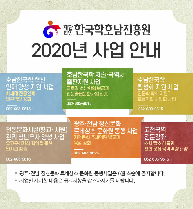 - 호남한국학 저술 국역서 출판지원 사업 : 글로컬 호남학의 보급과 인문출판문화사업 진흥 062-603-9615