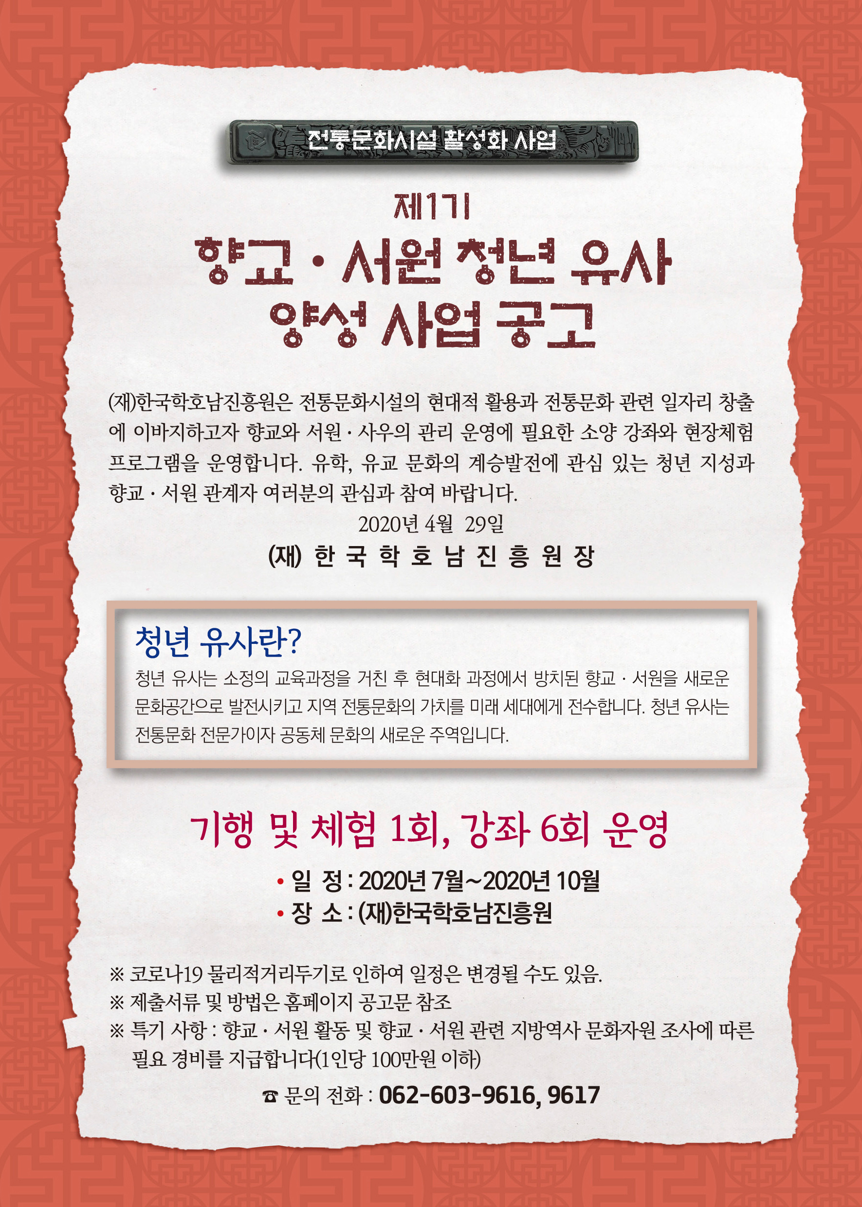 (재)한국학호남진흥원은 전통문화시설의 현대적 활용과 전통문화 관련 일자리 창출에 이바지하고자 향교와 서원 · 사우의 관리 운영에 필요한 소양 강좌와 현장체험 프로그램을 운영합니다. 유학, 유교 문화의 계승발전에 관심 있는 청년 지성과 향교·서원 관계자 여러분의 관심과 참여 바랍니다.