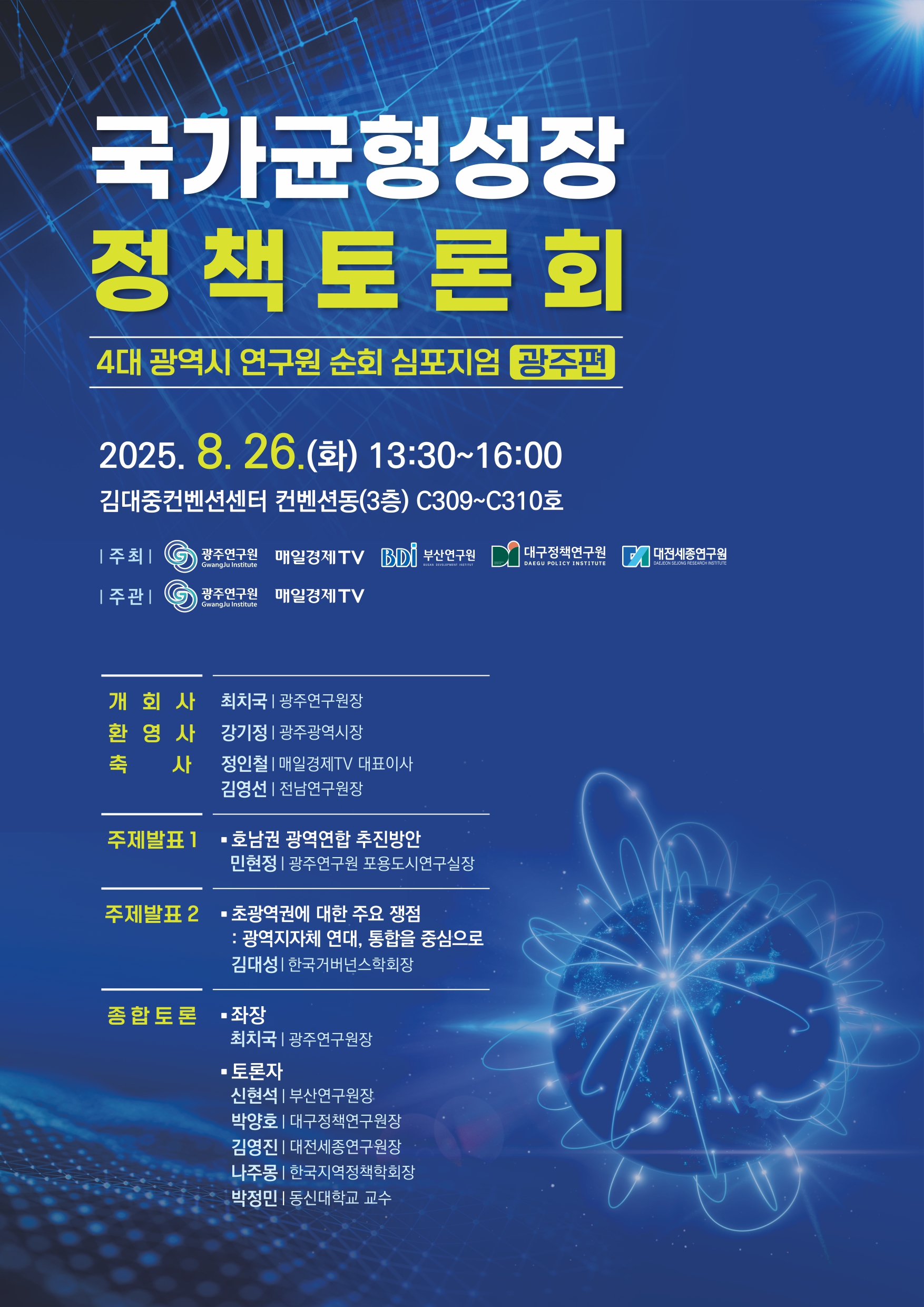 - 첨부파일 국가균형성장 정책토론회(4대 광역시 연구원 순회 심포지엄 광주편)_포스터 1부.jpg (1.58 MB) 미리보기 다운로드
