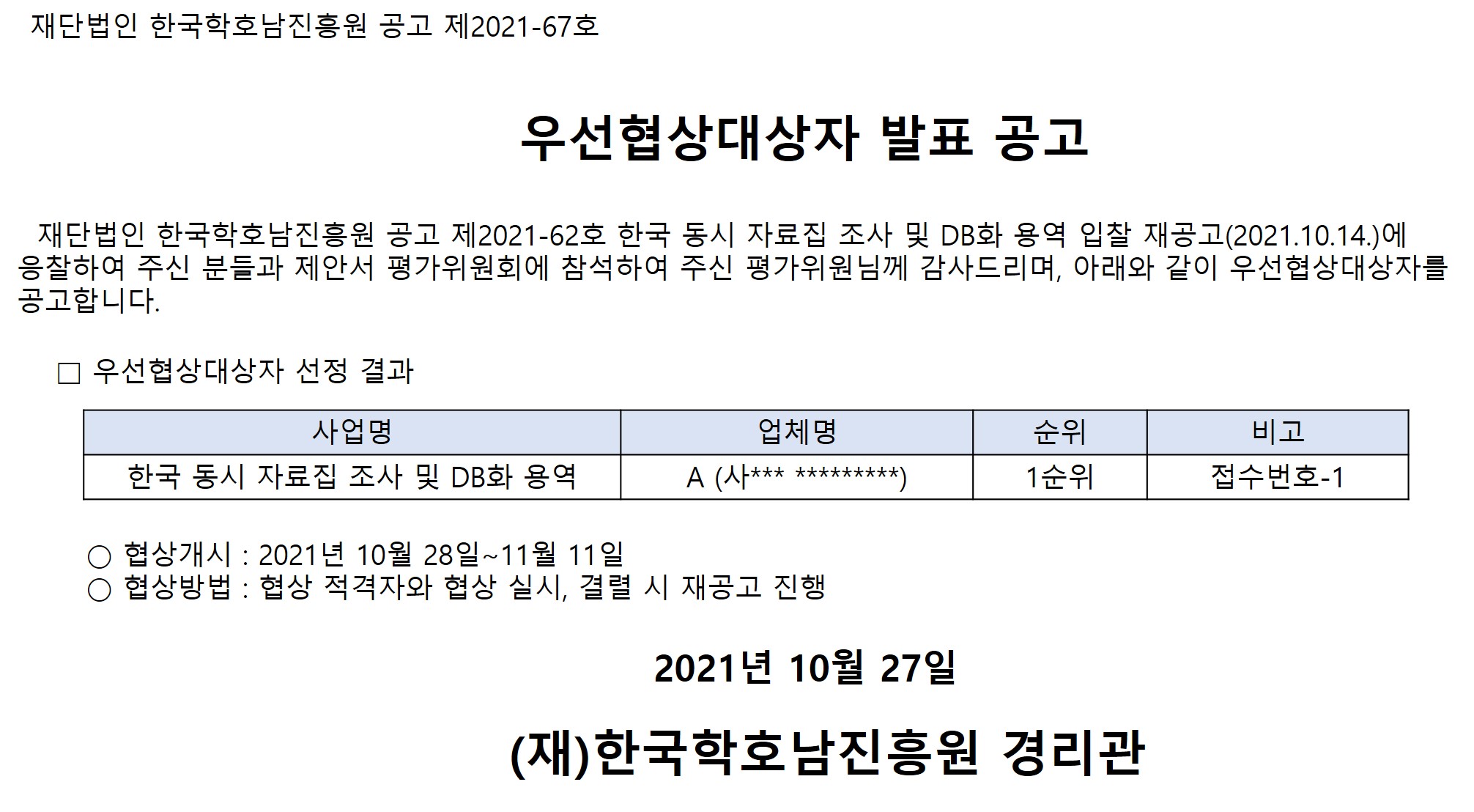 우선협상대상자 발표 공고(한국 동시 자료집 조사 및 DB화 용역)