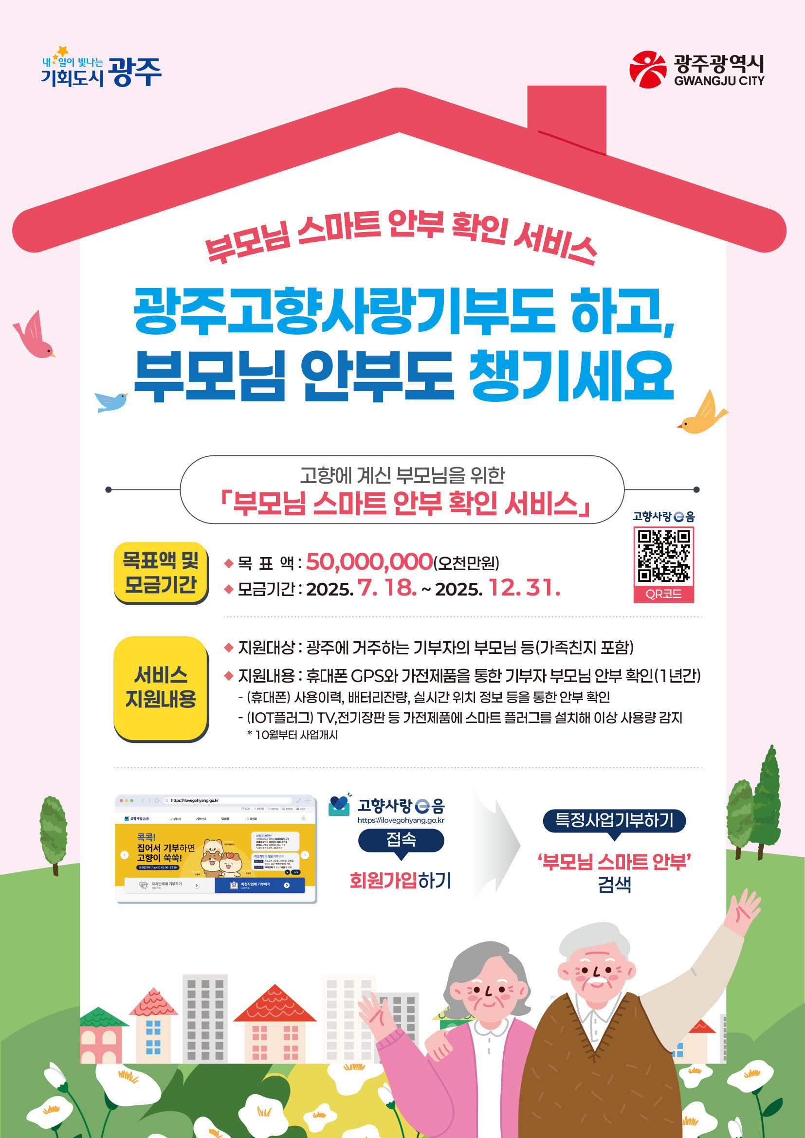 ※ 기부방법 : 고향사랑e음사이트 접속/특정사업 기부하기/'부모님 스마트 안부' 혹은 '따순광주' 검색