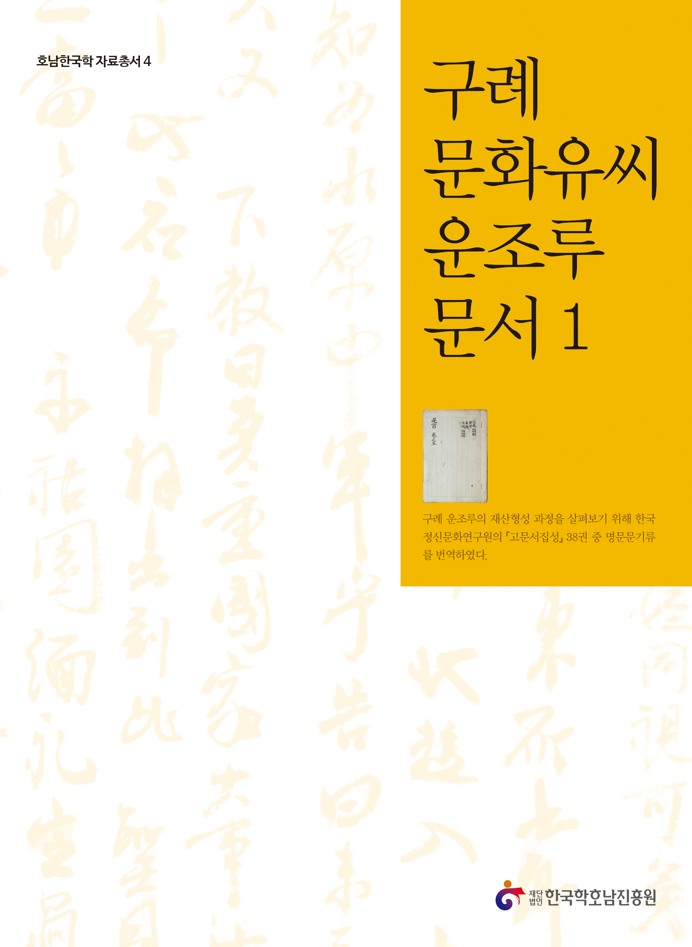 구례 문화유씨 운조루문서 조회수 : 1568 첨부파일 표지_운조루.jpg (1.40 MB) 미리보기 다운로드 편역자 : 권수용, 문현주, 최영희 책수 : 1 내용 : 운조루의 재산형성과정을 살펴보기 위해 한국정신문화연구원의 『고문서집성』 38권을 저본으로 하고, 그중 명문문기류만을 번역하였다. 운조루에 소장된 많은 고문헌 중에서 명문문기류와 관련문서는 550여건에 이른데, 이것을 국역하여 일반사람들도 쉽게 이해할 수 있게 하였다. 운조루는 유이주(柳爾胄)가 1770년대에 대구에서 구례로 입거하여 세운 건축물로 알려졌으며, 현재까지도 그 명성에 걸맞게 외형물과 내용물 잘 보존된 고택이다.