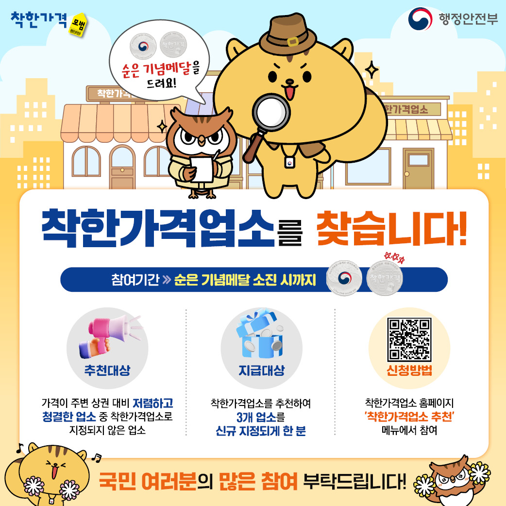 이와 관련하여, 국민이 직접 착한가격업소를 발굴·추천하는 ‘착한가격업소 대국민 추천공모’를 상시 운영하고 있으니 착한가격업소 발굴에 적극 동참하여 주시기 바랍니다.