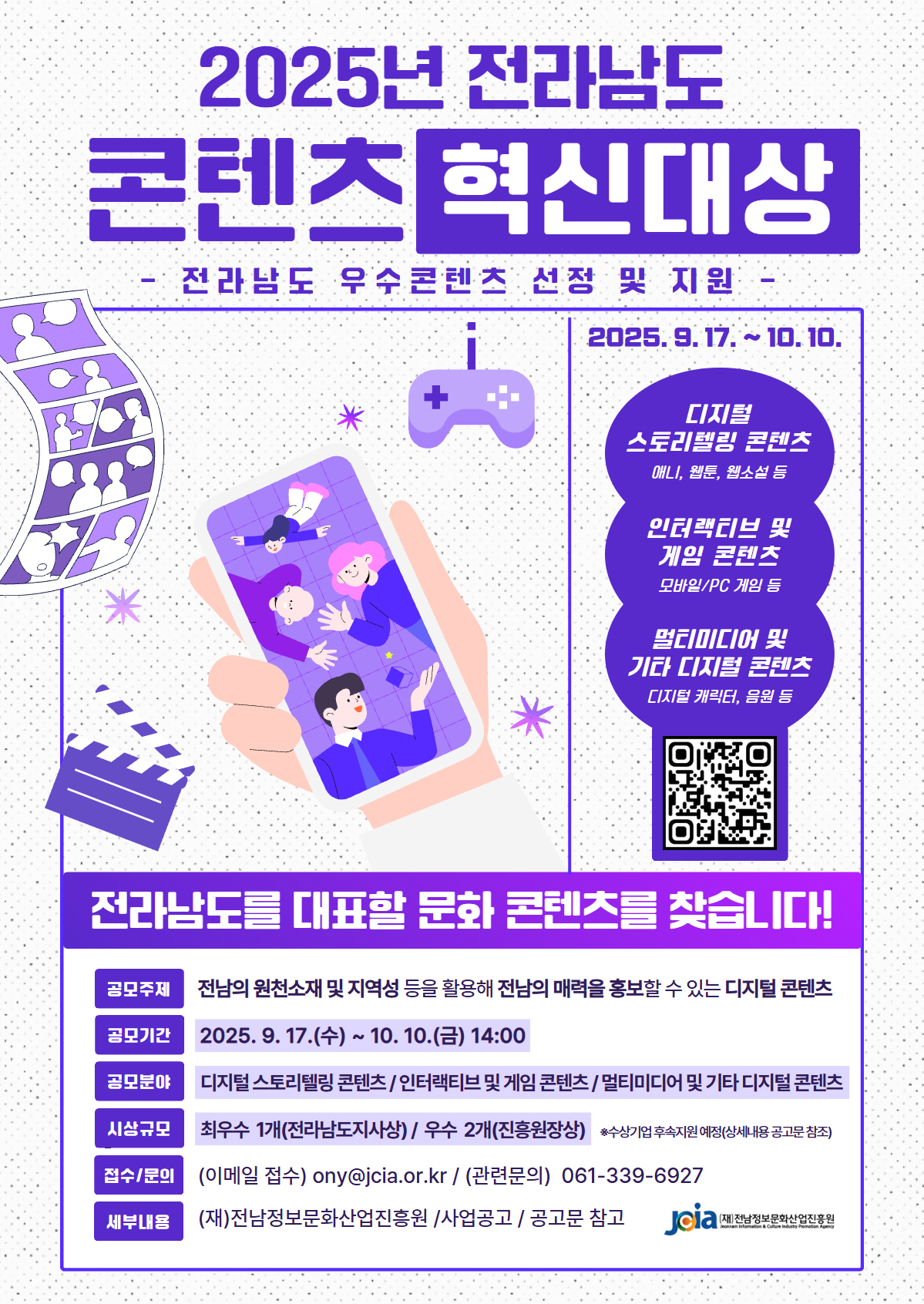 전라남도와 재단법인 전남정보문화산업진흥원에서는 K-콘텐츠 시대를 맞이하여 지역 문화예술자원의 콘텐츠 융복합화를 통한 지역 대표 콘텐츠 집중 육성 및 후속지원을 위해‘2025년 전라남도 콘텐츠 혁신대상(전라남도 우수콘텐츠 선정 및 지원)’을 추진 중에 있습니다.