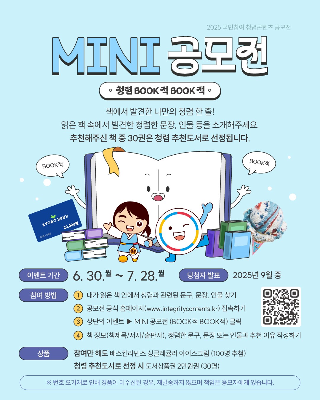 가. 공모전명 : 2025년 제11회 국민참여 청렴콘텐츠 MINI 공모전(BOOK적 BOOK적)