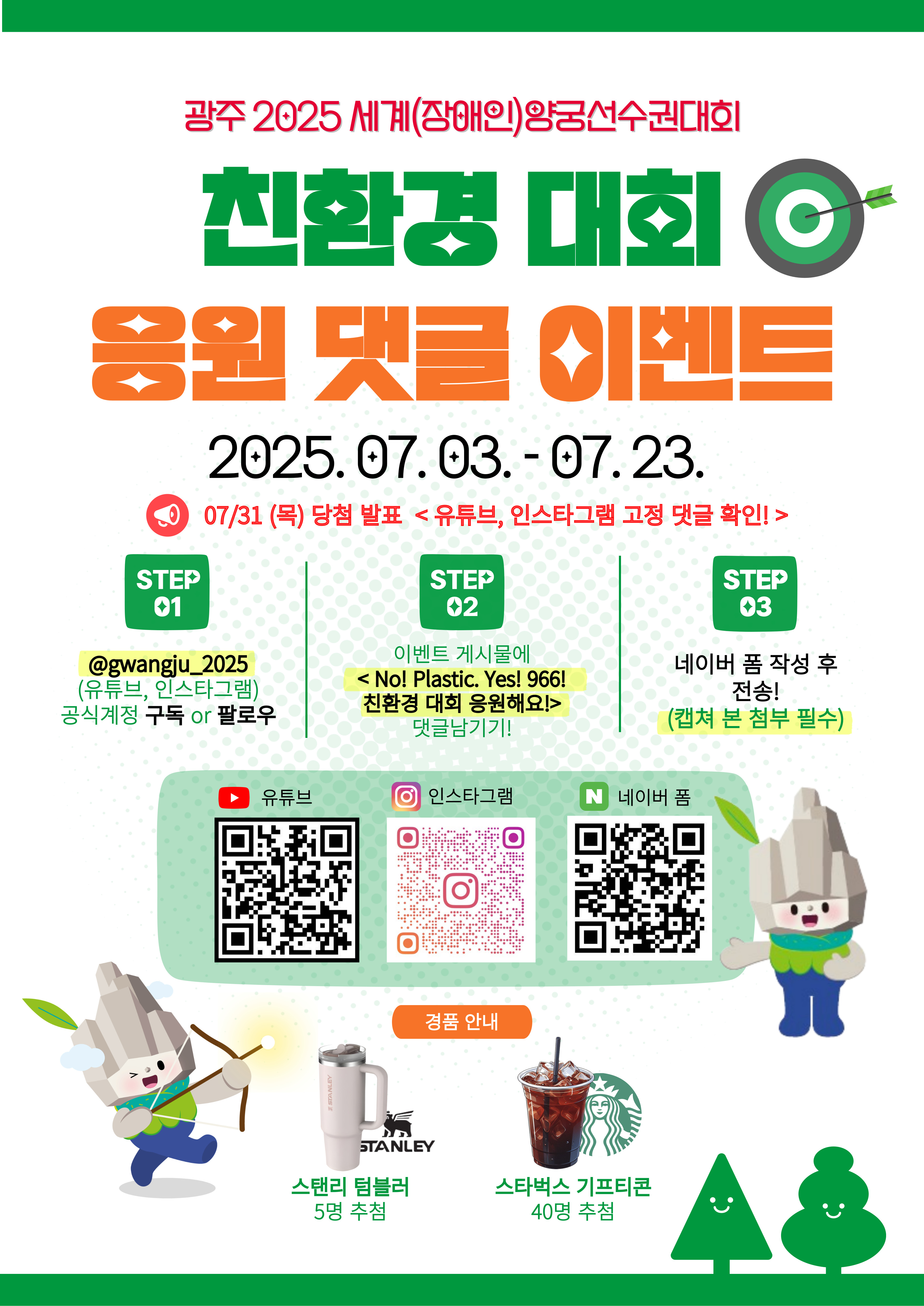 - 첨부파일 광주 2025 세계(장애인)양궁선수권대회_친환경대회 응원 댓글이벤트_포스터.jpg (1.71 MB) 미리보기 다운로드