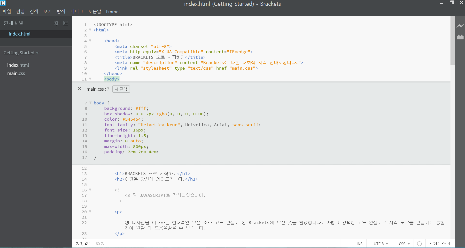 Brackets을 사용하여 자신의 코드를 편집하려면 파일이 들어있는 폴더를 열면 됩니다. Brackets은 현재 열려있는 폴더를 "프로젝트"로 취급합니다. 코드 힌트, 실시간 미리보기 및 빠른 편집과 같은 기능은 현재 열려있는 폴더 내의 파일에만 사용합니다.